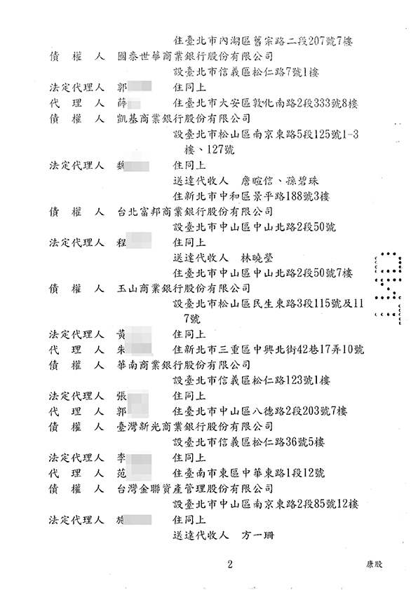張小姐,現年62歲,職業為攤販,平均每月收入1.4萬元,總積欠債務7042455元,依據消費者債務清理條例向台南地院聲請更生程序,台南地院依據其生活必要支出費用及扶養費的支出後,裁定其以每1個月為一期,分6年,共72期,自更生方案認可確定之翌月起,每期清償金額新台幣4000元,清償總金額288000元,總清償比例4%。 |