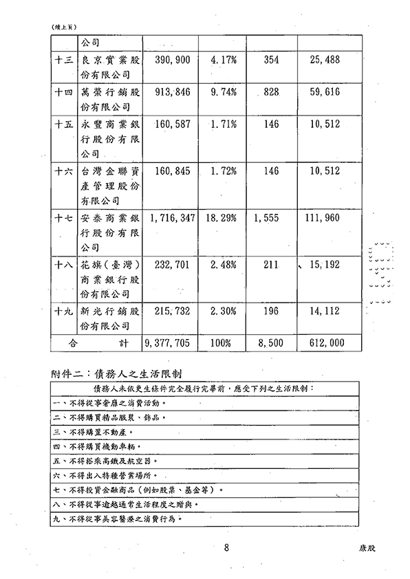許小姐,現年43歲,職業為助理理髮師,平均每月收入2.38萬元,總積欠債務9377705元,依據消費者債務清理條例向台南地院聲請更生程序,台南地院依據其生活必要支出費用及扶養費的支出後,裁定其以每1個月為一期,分6年,共72期,自更生方案認可確定之翌月起,每期清償金額新台幣8500元,清償總金額612000元,總清償比例6.5%。 |