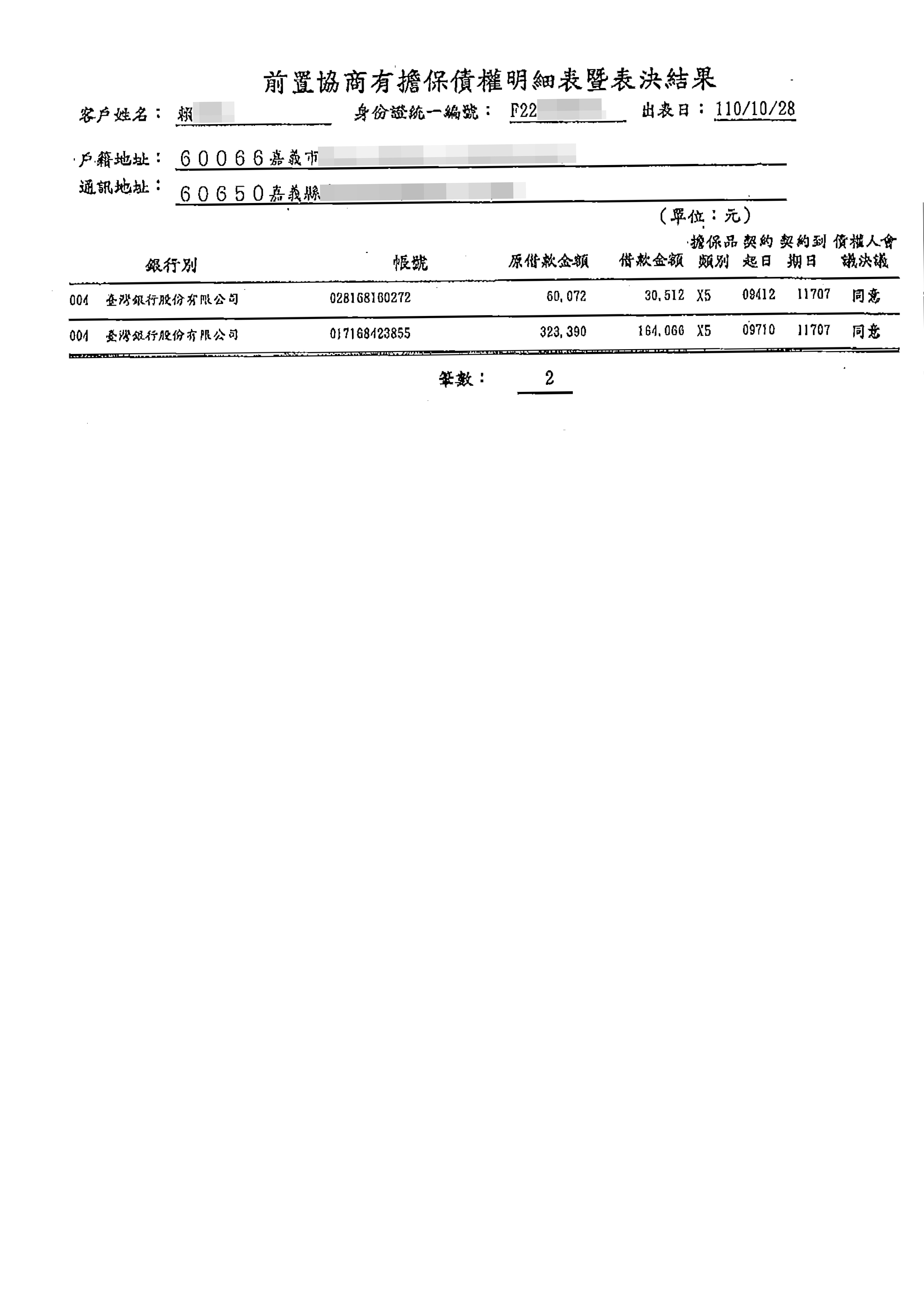 賴小姐,現年32歲,職業為代理店長,平均月薪為新台幣2.4萬元,總債務為新台幣1026000元,經本會協助處理後,協商方案為每1個月為一期,分180期清償,利率為5%,每期清償金額為新台幣5700元。